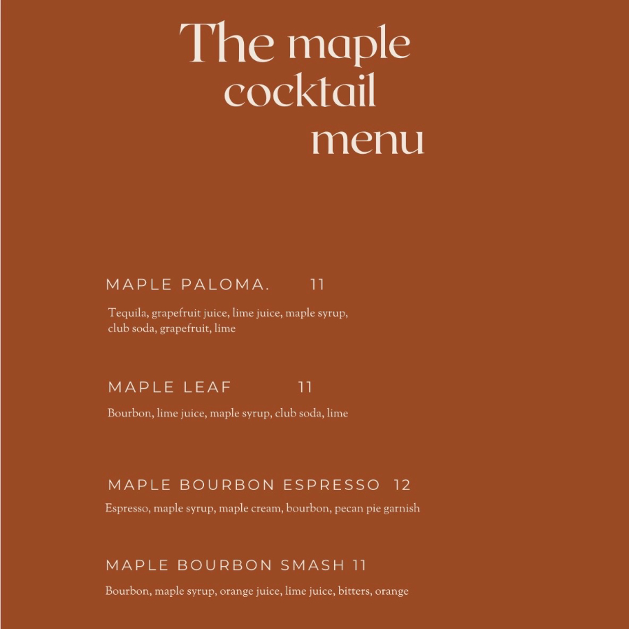 - 4 Maple Cocktails: Maple Paloma, Maple Leaf, Maple Bourbon Espresso and Maple Bourbon Smash (see menu for more details)