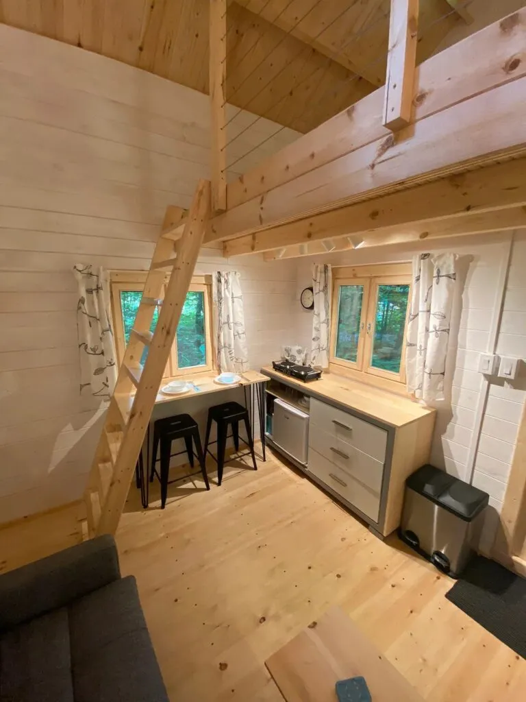 If you’ve ever wanted to experience tiny-house living, this secluded forested oasis near the mighty Madawaska is a great choice. Ideal for one or two people, the wood-paneled interior has a wood-burning fireplace, one mattress in the tiny loft, a second mattress downstairs that doubles as a couch, a composting toilet, and a small kitchen with a gas stove and sink. Outside is the shower, firepit, hammock, and outdoor dining area. The Madawaska is just a short trail walk away, where you’ll only find one other cabin across the river.