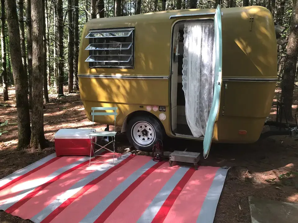 Go retro in a 1970s trailer located on a private beach in the pines. Though small, the yellow egg has everything two people need for an elevated off-grid camping experience, including a double bed and a kitchen. There is a firepit and outhouse here as well, plus a hammock and screened dining tent with a cooler. The propane barbecue is sufficient for a feast, but just make sure you take a load off afterwards in the Adirondack chairs with the river lapping around your ankles.